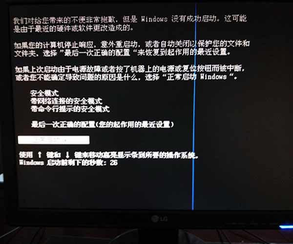 开机时长按F8,进入选项页面,选择“*近一次的正确配置”,敲下回车键。在进入系统之后,开启电脑上的查杀病毒软件,杀毒,如果查到病毒,杀毒后重启动电脑,假如还不正常,则可能是由设备驱动与程序不兼容引起的,删除显卡、网卡等驱动程序,删除驱动之后重启,如果不行的话那就排除这一原因。