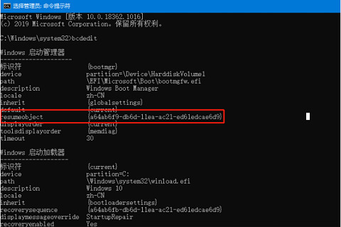 4、再在打开的“命令提示符”界面中,输入“bcdedit”命令,在按“回车键”,在找到“resumeobject”,记录后面的字符串;