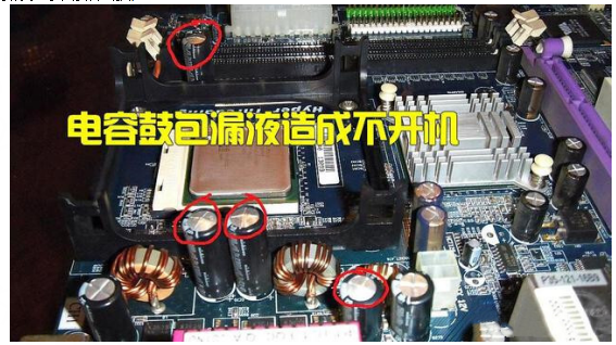 2、查看主板是否有电容鼓包漏液,如果有就需要将电容更换,动手能力强的自己换,不行的拿到维修店去换;