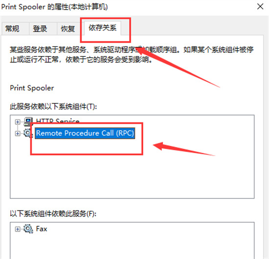 2、找到print spooler服务右键,点击选择“属性”选项,点击上方“依存关系”,找到“print spooler”服务所依赖的相关服务rpc。
