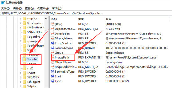 4、进入注册表定位到HKEY_LOCAL_MACHINE/System/currentcontrolset/services/Spooler,在Spooler项右方新建字符串值命名为Imagepath。