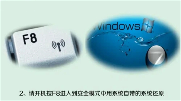 1、开机按“F8”进入到“安全模式”中,用系统自带的系统还原。