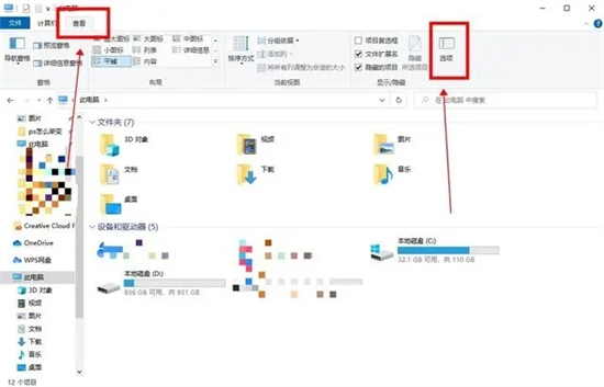 1、将U盘插入进电脑,点击进入“此电脑”,在此电脑窗口中点击“查看”下的“选项”;