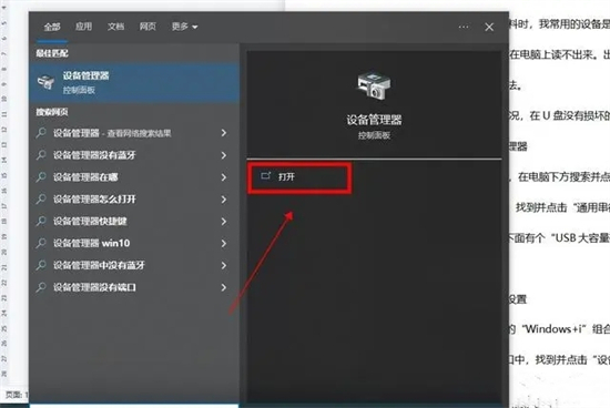 1、将U盘插入进电脑,在电脑中搜索并点击打开“设备管理器”;