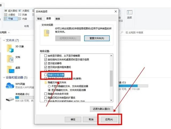 3、在下方的高级设置中,取消勾选“隐藏空的驱动器”,点击“应用”即可。