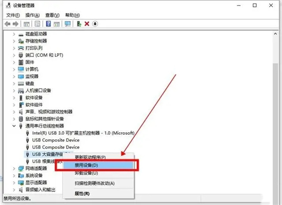 3、下拉选项中有“USB大容量存储设备”,选中并右键点击“禁用设备”即可。