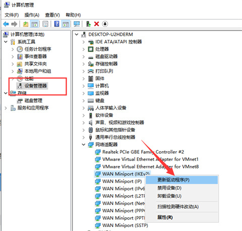 2、选择设备管理器,右侧找到网络适配器,打开后找到无线网卡设备,查看驱动有没有出现黄色的感叹号,右击选择更新驱动程序即可(需要电脑联网,可以插入网线)