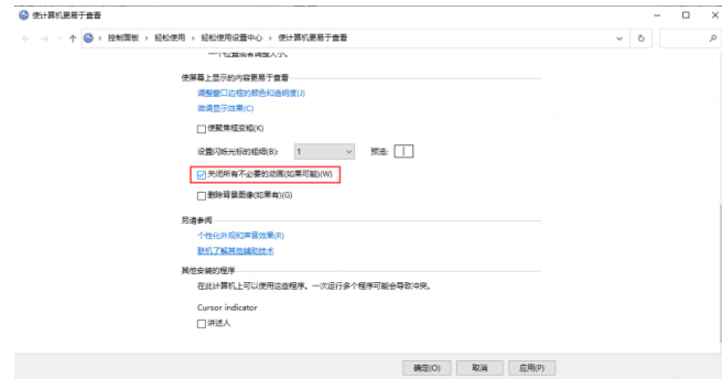 我们在使用电脑的过程中,常常会出现一些莫名的动画特效,如:弹窗、互动设计等,这些动画并不能够使得我们的操作更流畅,也未能给我们提供使用上的便利,只一味地占用运行的内存,我们可以在【控制面板——轻松使用——设置中心】里勾选“关闭所有不必要的动画”选项,降低不必要的能耗。