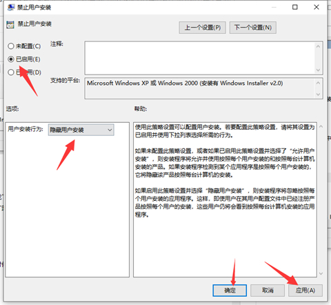 打开“禁止用户安装”并选择“隐藏用户安装”,电脑也不会自动下载乱七八糟的软件了;